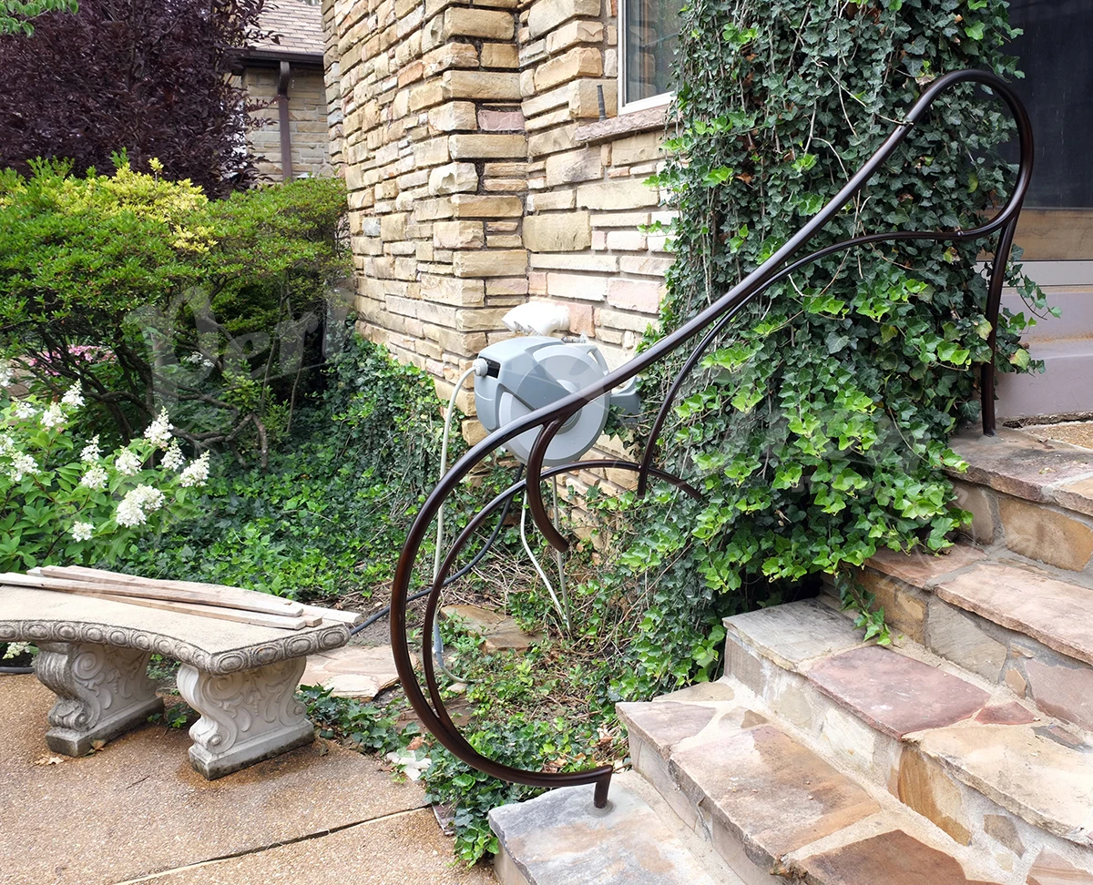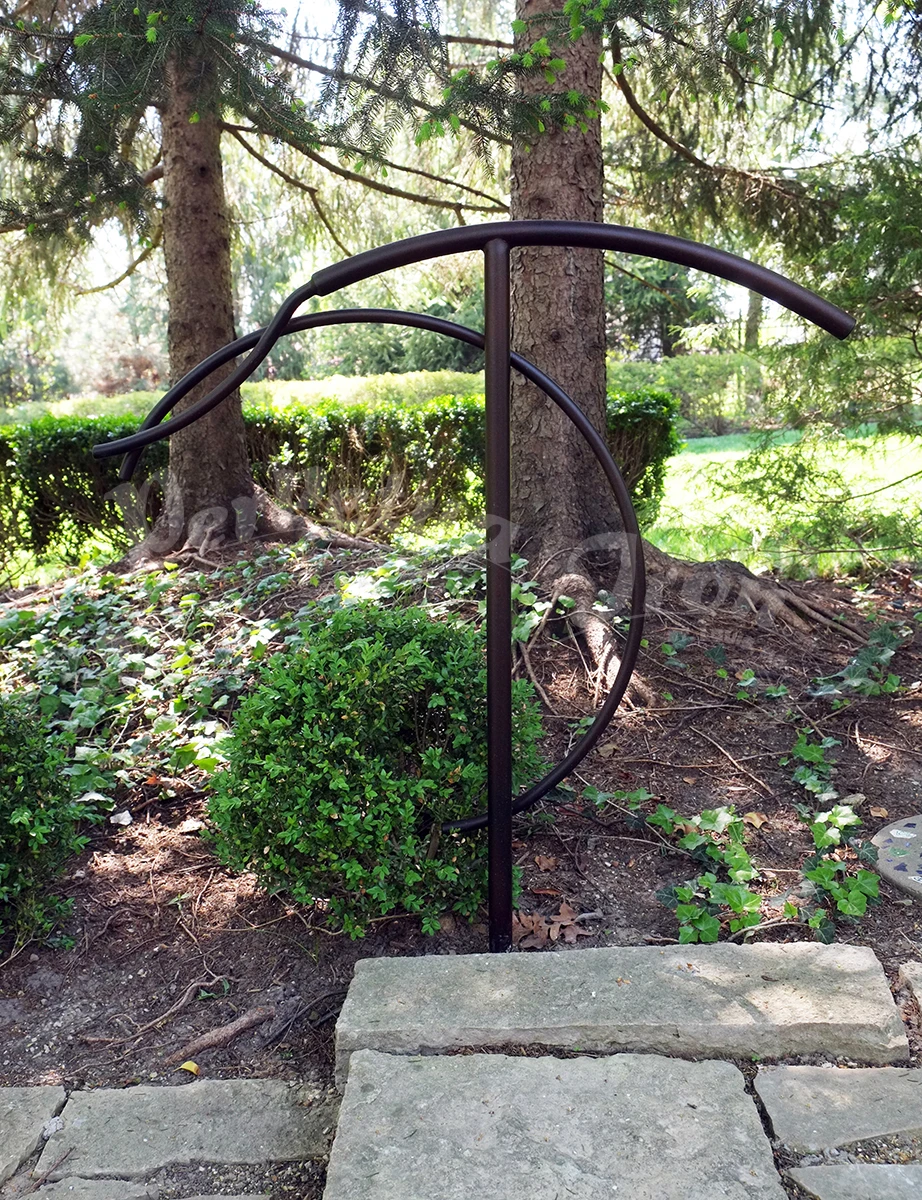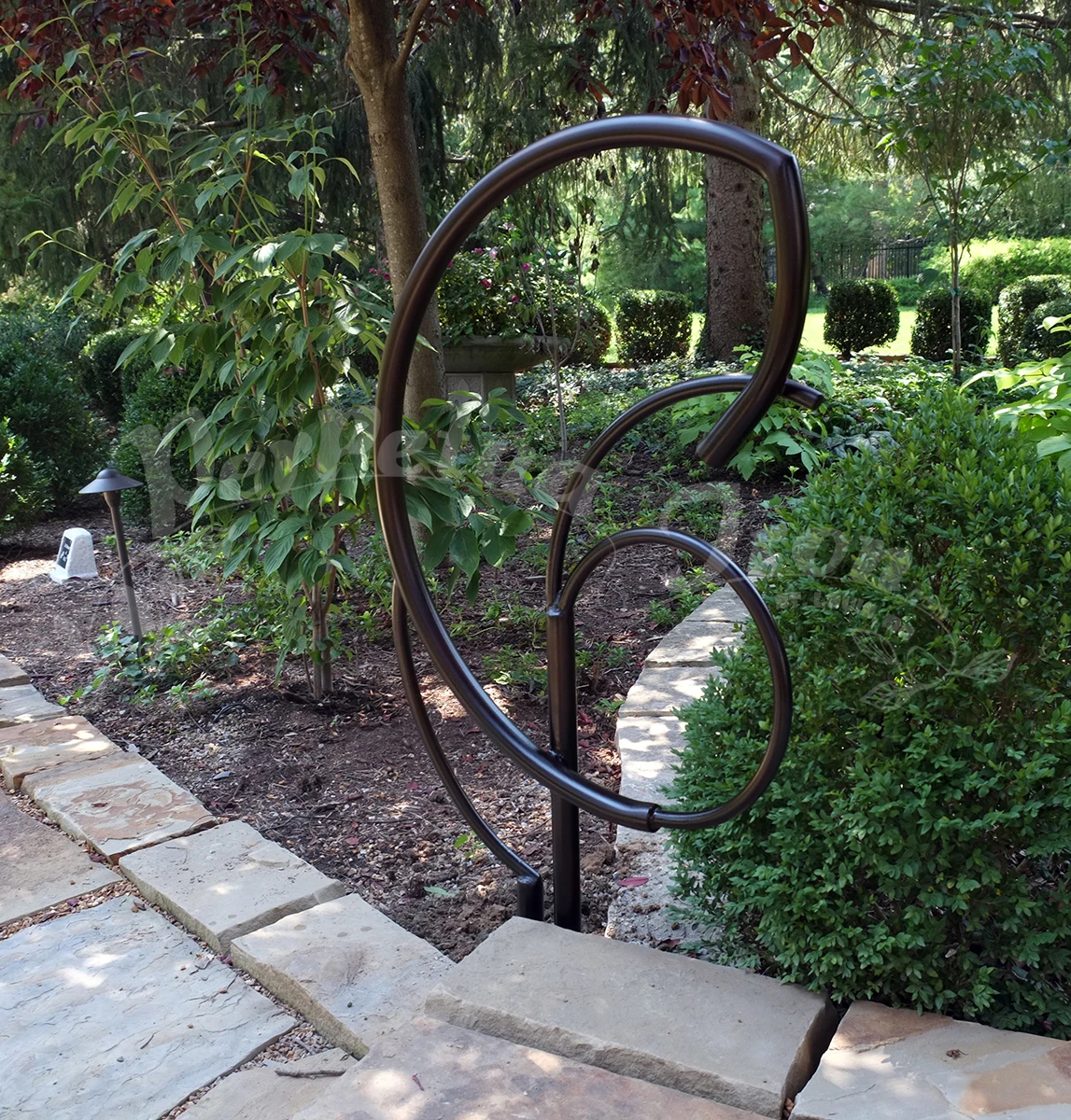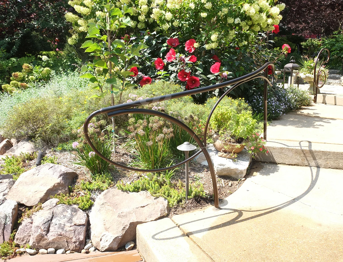 A series of railings were made for a customer’s garden: a magnificent site with years of design and plantings – a truly beautiful place and an honor to make work for! Our customer is open minded and adventurous and so we were able to imagine freely these railings for the pathways and steps in the garden.